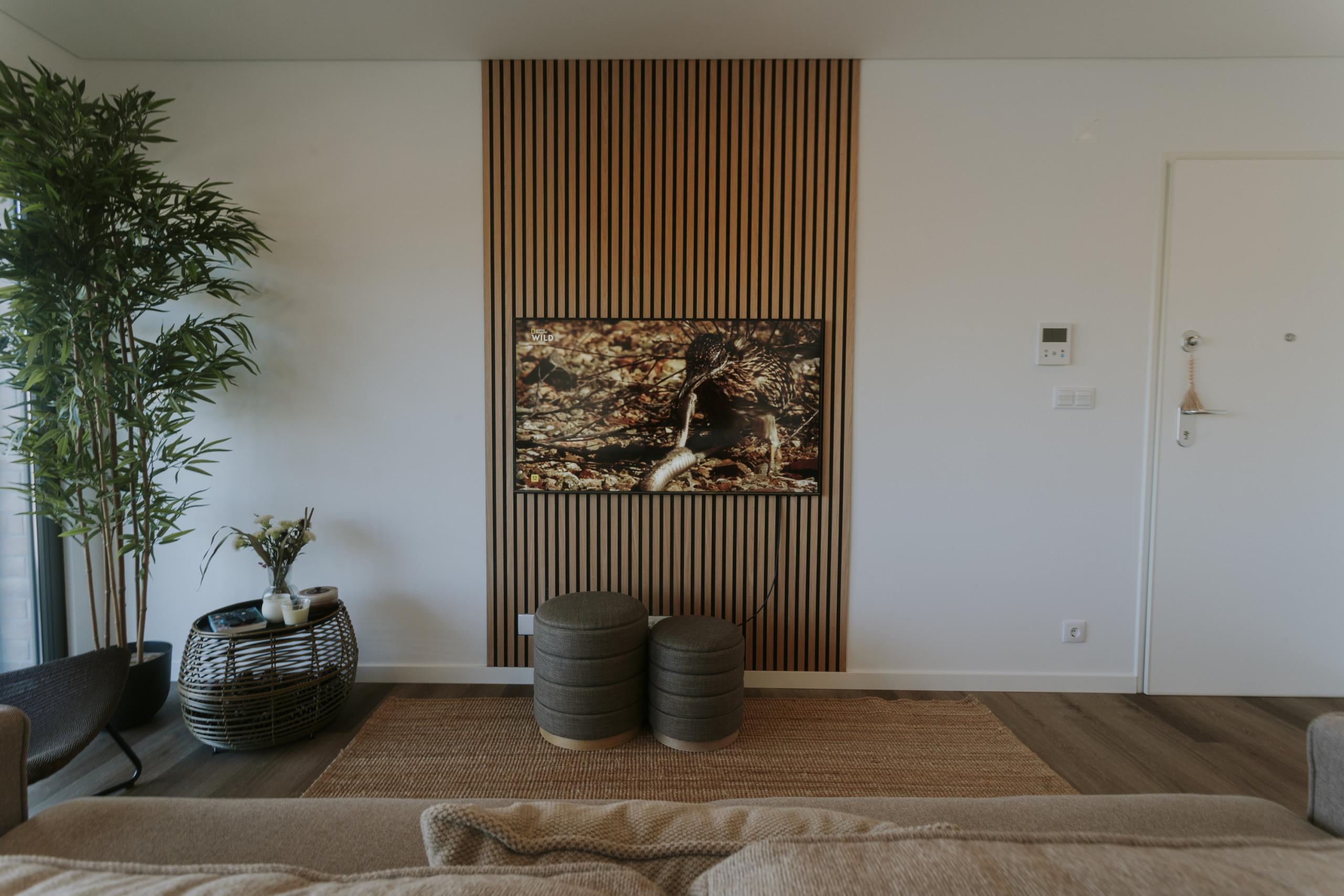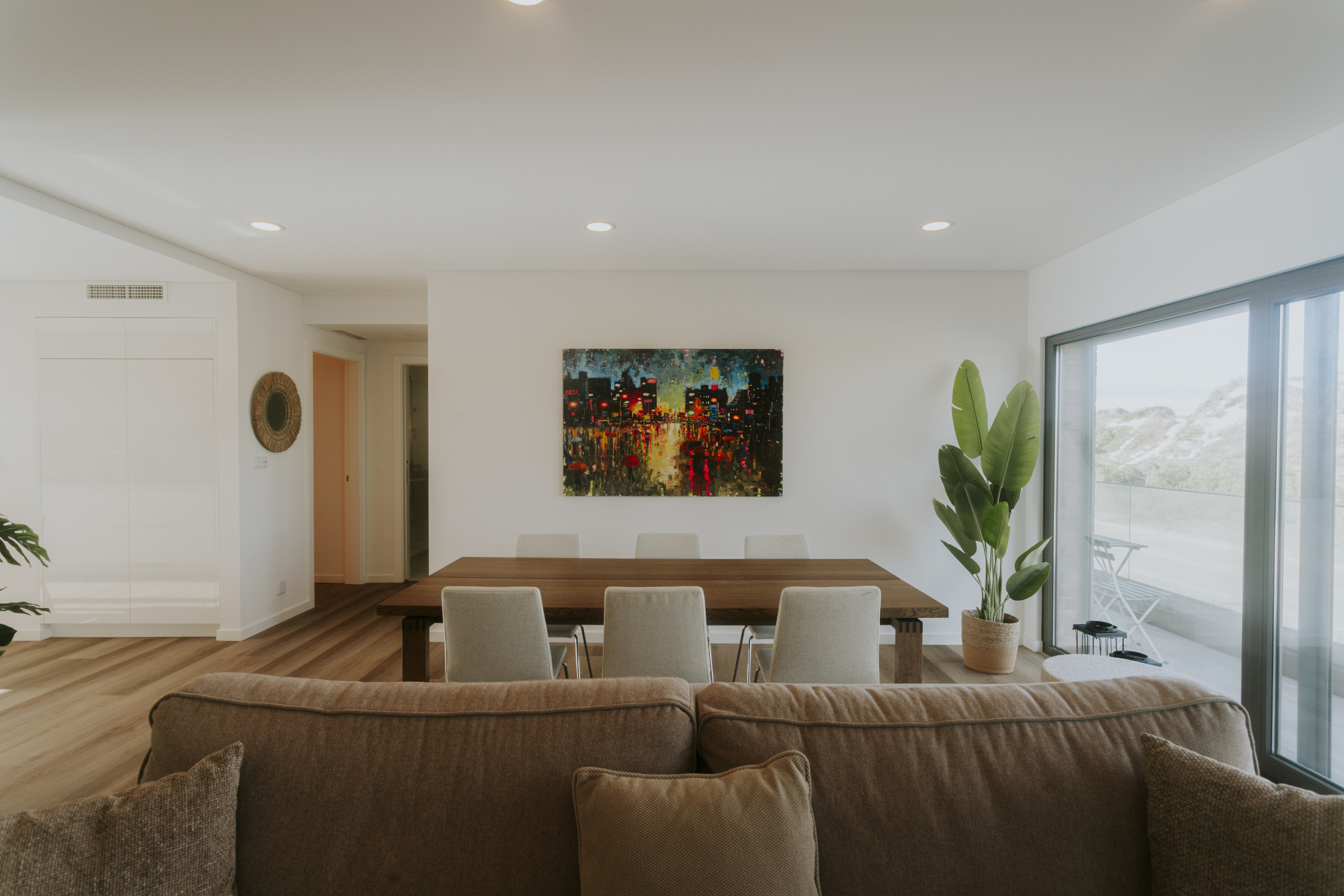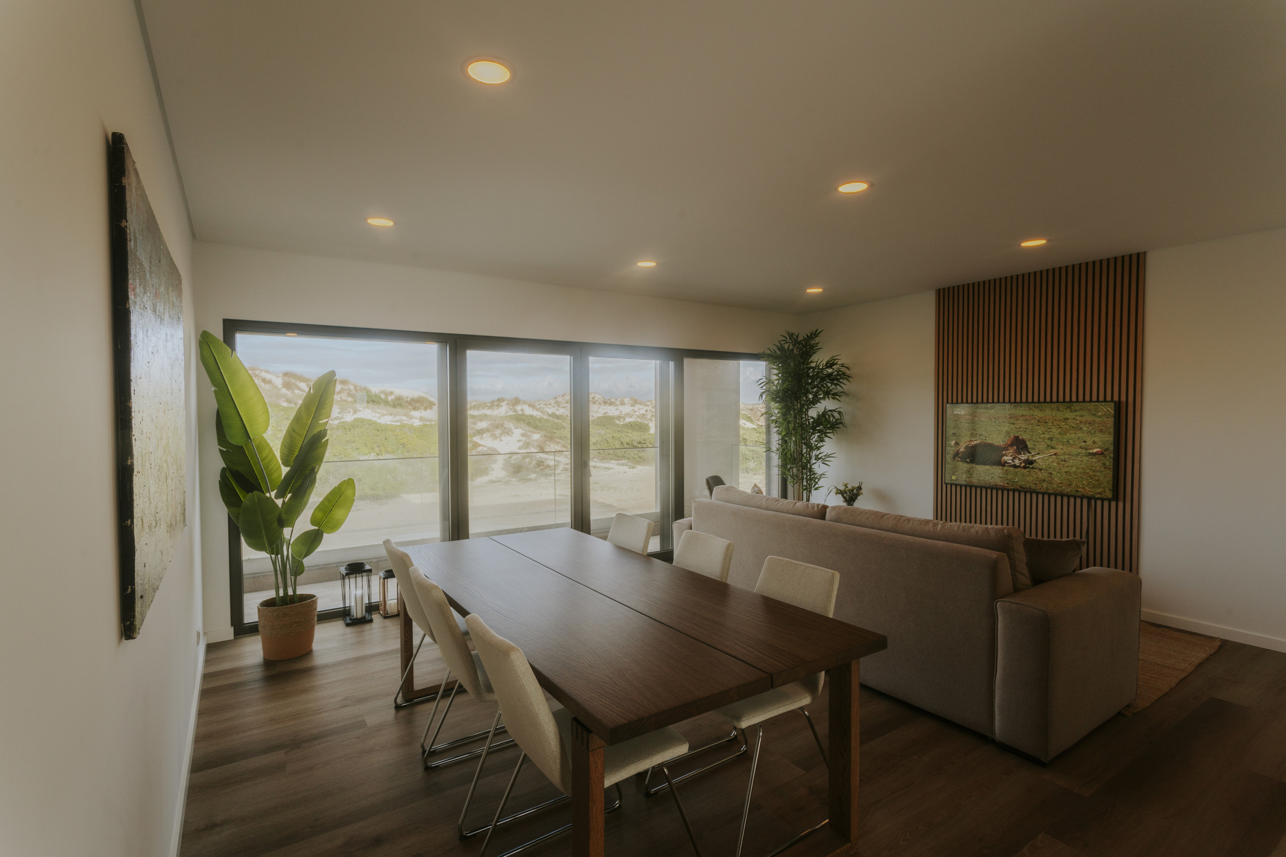 A cozinha americana totalmente equipada convida a momentos gastronômicos, com eletrodomésticos modernos como frigorifico, forno, máquina de café, micro-ondas e outros utensílios essenciais. A sala de estar conta com ar condicionado e televisão com canais, garantindo entretenimento para todos os gostos.