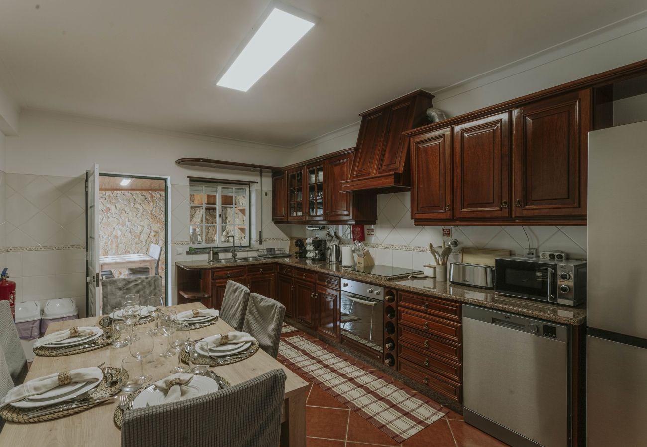 A cozinha totalmente equipada é um verdadeiro sonho para os amantes de culinária, apresentando todos os eletrodomésticos essenciais: frigorífico, máquina de lavar roupa e loiça, forno, máquina de café, micro-ondas e muito mais. A área de jantar convida a momentos de partilha e refeições memoráveis.