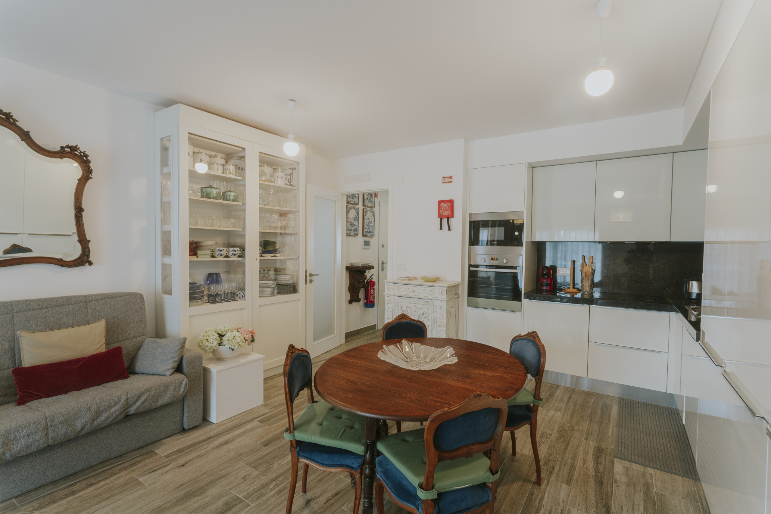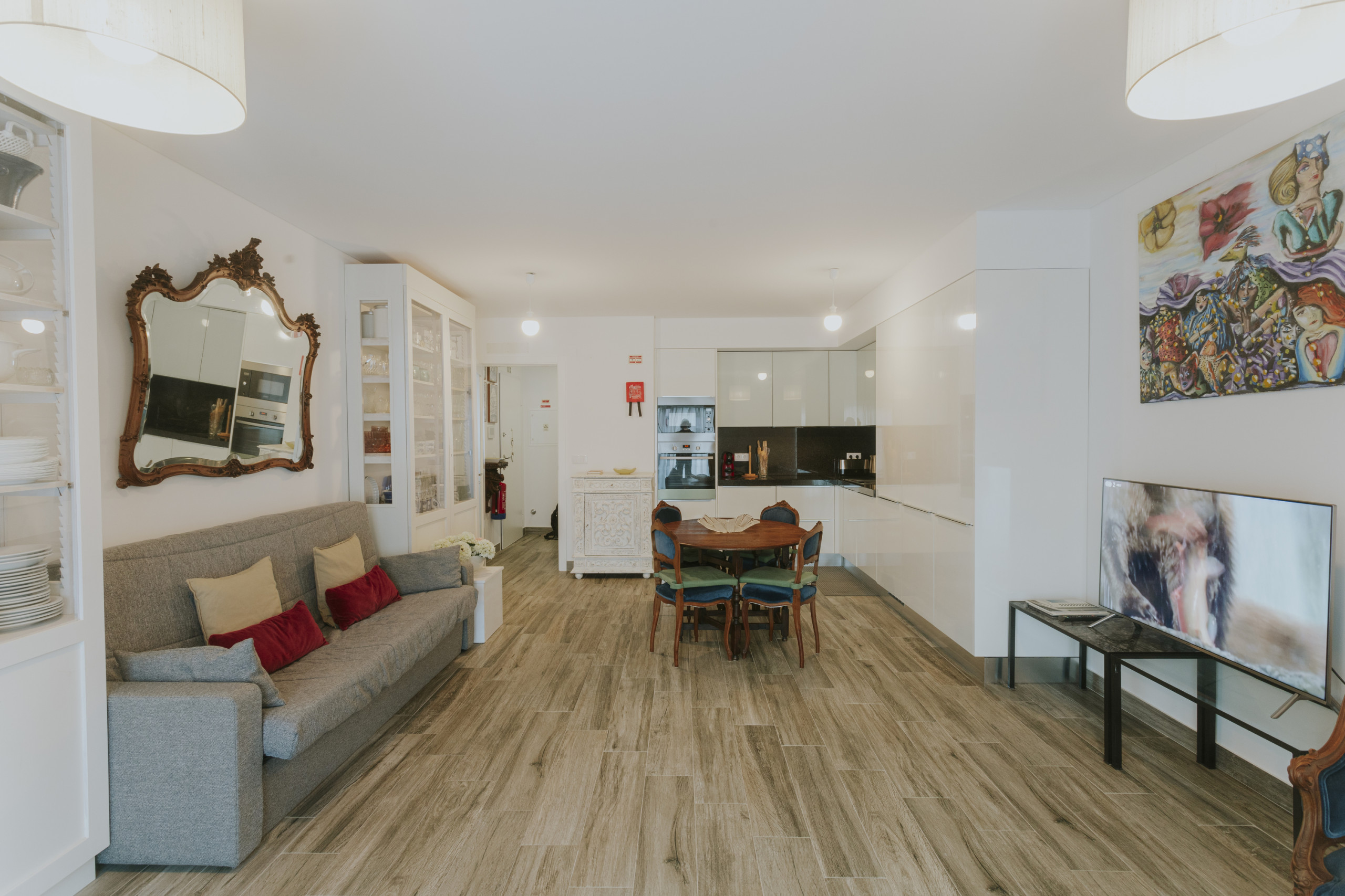 El apartamento cuenta con una distribución inteligente del espacio, incluyendo una habitación con dos camas individuales y una sala de estar con un sofá-cama de matrimonio, garantizando flexibilidad para diferentes configuraciones de alojamiento. La cocina americana equipada permite que los huéspedes preparen comidas deliciosas, con electrodomésticos como cafetera, horno, microondas, tostadora y lavavajillas.