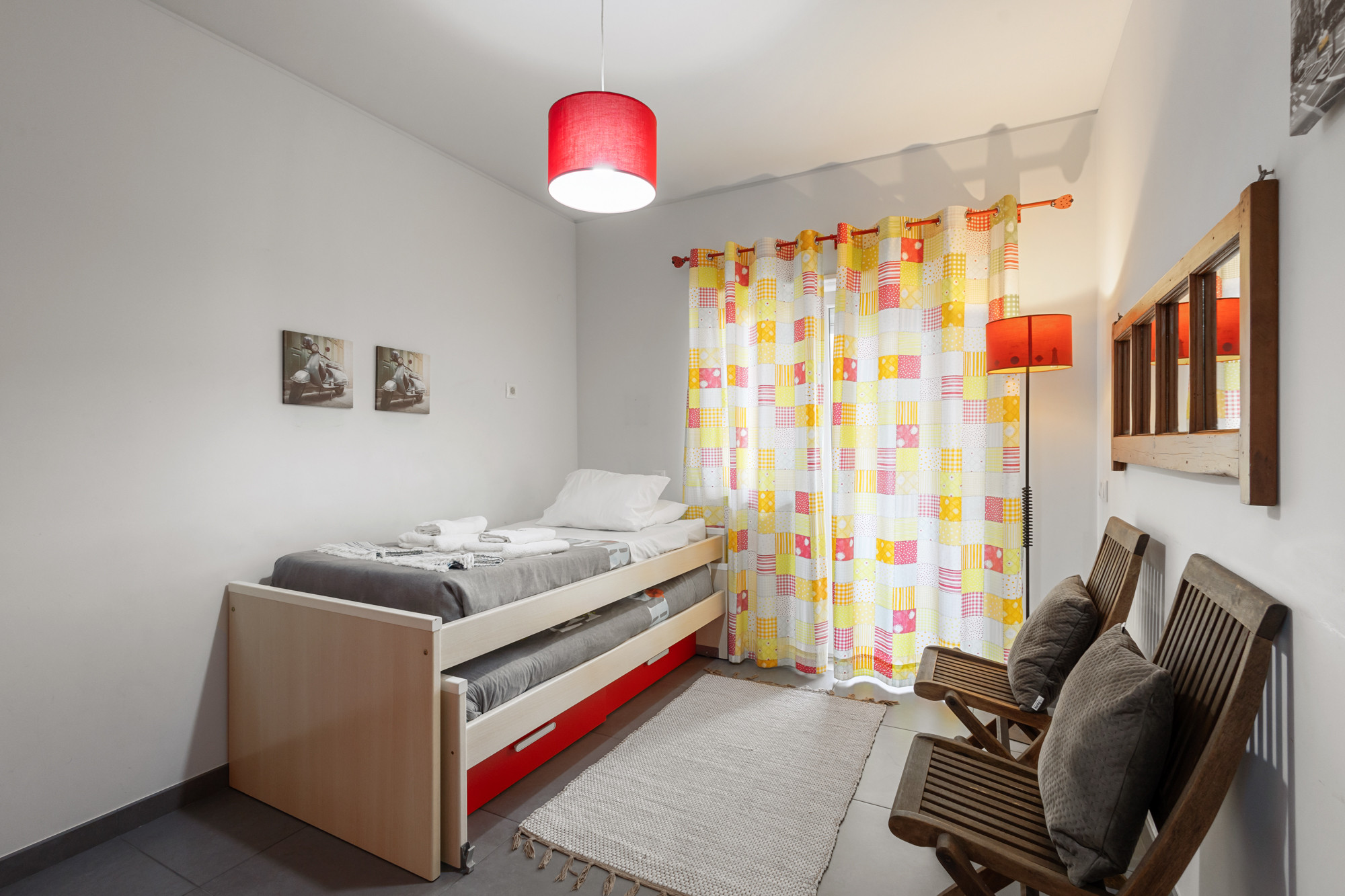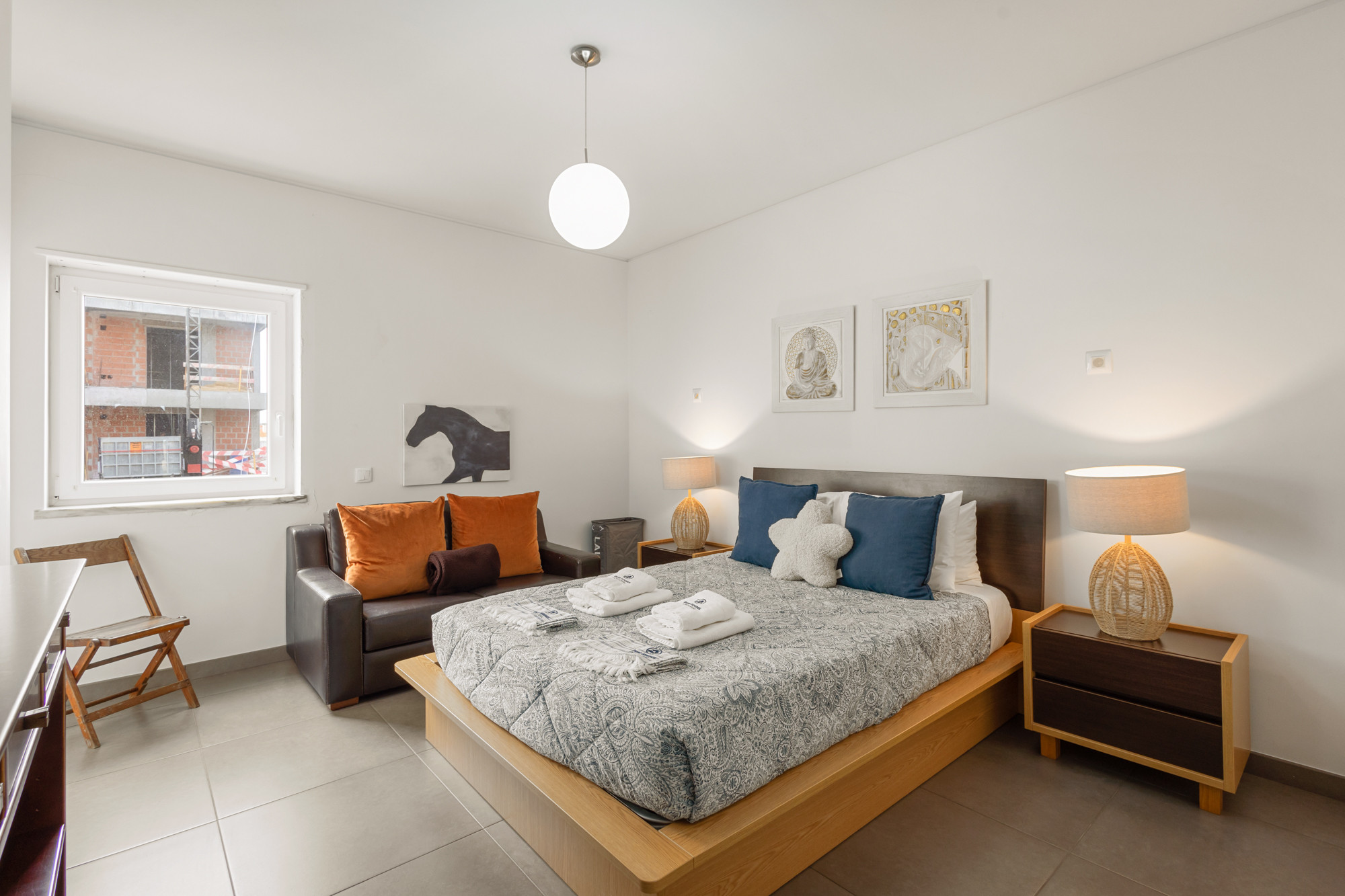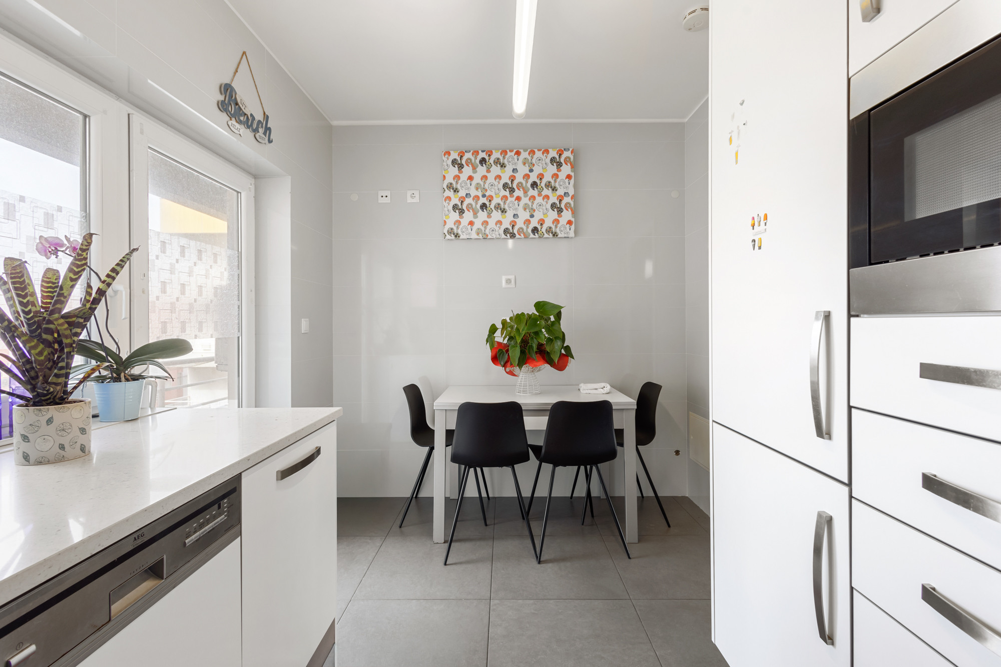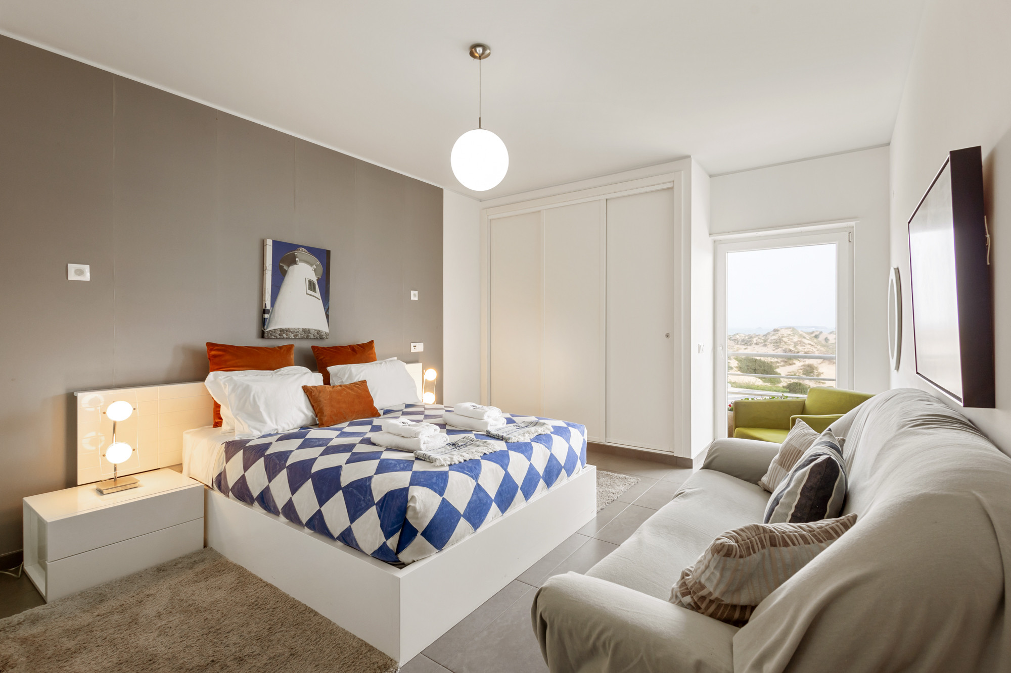El apartamento cuenta con dos habitaciones y una sala de estar cómodas, ofreciendo flexibilidad de alojamiento con una cama de matrimonio, un sofá-cama y dos camas individuales. La luminosidad y el diseño práctico garantizan un ambiente acogedor y relajante después de un día de exploración de las maravillas de Peniche.